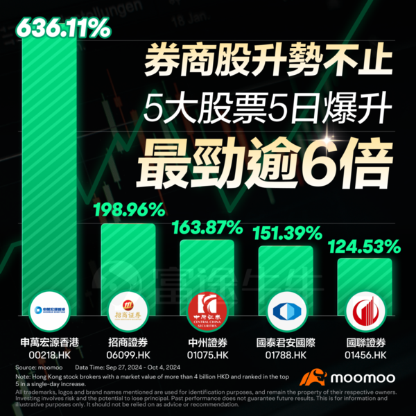 值得注意的是,券商股作為牛市旗手,在本輪上漲行情中扮演著“急先鋒”的角色。而港股市場上的中資券商股漲幅更是驚人,從近5個交易日升幅來看, $申萬巨集源香港 (00218.HK)$ 累計升幅超6倍, $招商證券 (06099.HK)$ 漲近2倍, $中州證券 (01375.HK)$ 、 $國泰君安國際 (01788.HK)$ 均累漲超150%, $國聯證券 (01456.HK)$ 漲超124%。
