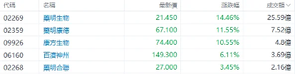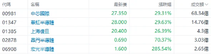 此外,今日港股也出現了板塊輪動的現象,晶元股、生物科技股接力上漲。截至收盤, $巨集光半導體 (06908.HK)$ 漲285%, $晶門半導體 (02878.HK)$ 漲超70%, $中芯國際 (00981.HK)$、 $華虹半導體 (01347.HK)$ 等多隻個股漲超20%。